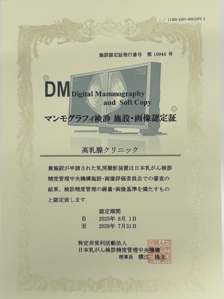 この度、日本乳がん検診精度管理中央機構の審査に合格し「マンモグラフィ検診・画像認定施設」として更新認定を受けました。